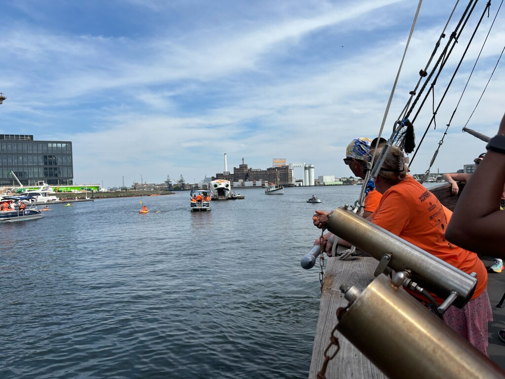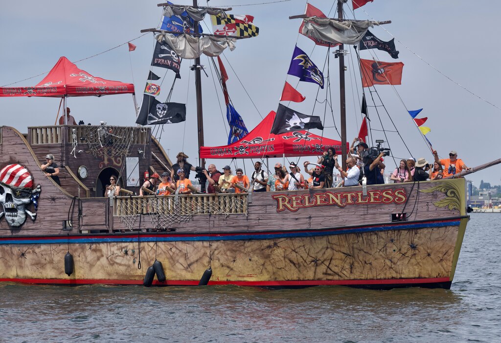 Pumphrey’s family set sail aboard Urban Pirates, a staple in Fells Point, around 2:20 p.m., with many members wearing an orange shirt featuring art for the swim — a woman swimming with Mr. Trash Wheel and a Maryland flag behind her. Some dressed up as pirates. They played music and blew themed sword balloons.