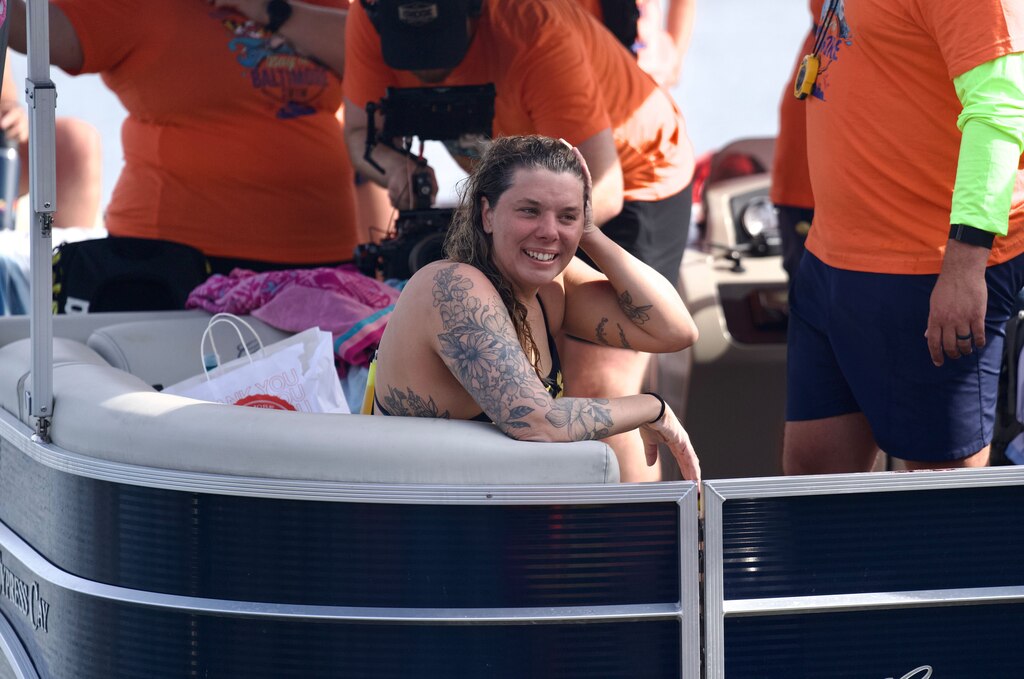 A horn blew as she began walking from the shoreline, her crew — made up of loved ones — cheered for her. She walked until the water reached her thighs, adjusted her cap and went underwater. Her brother Chris Pumphrey kayaked near her, wearing a headlight to help guide her.