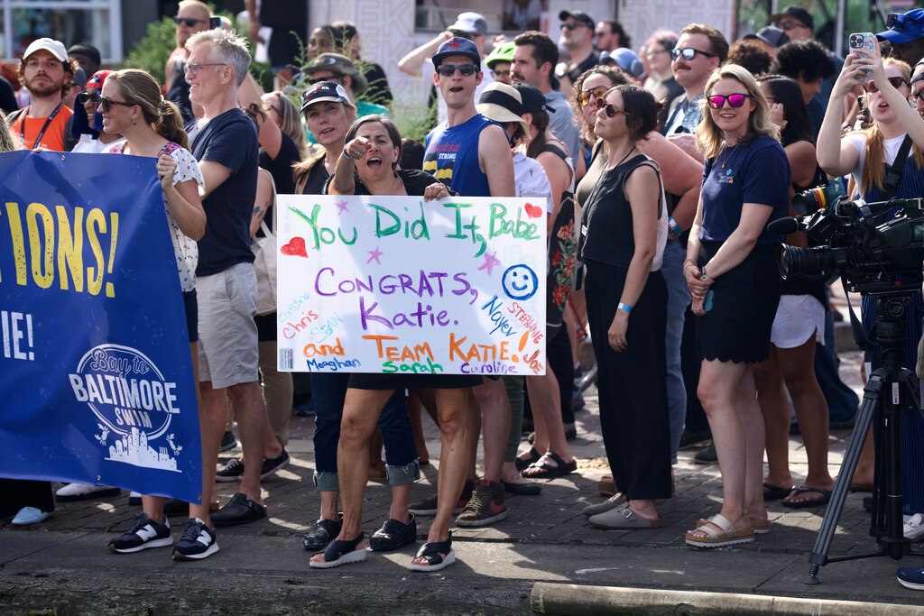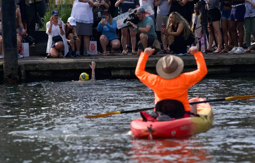 A little after 5 p.m., the landing in front of the Inner Harbor’s amphitheater was packed with people lined up to see her arrive. The sound of boat horns and helicopters rang out as she swum the final stretch.