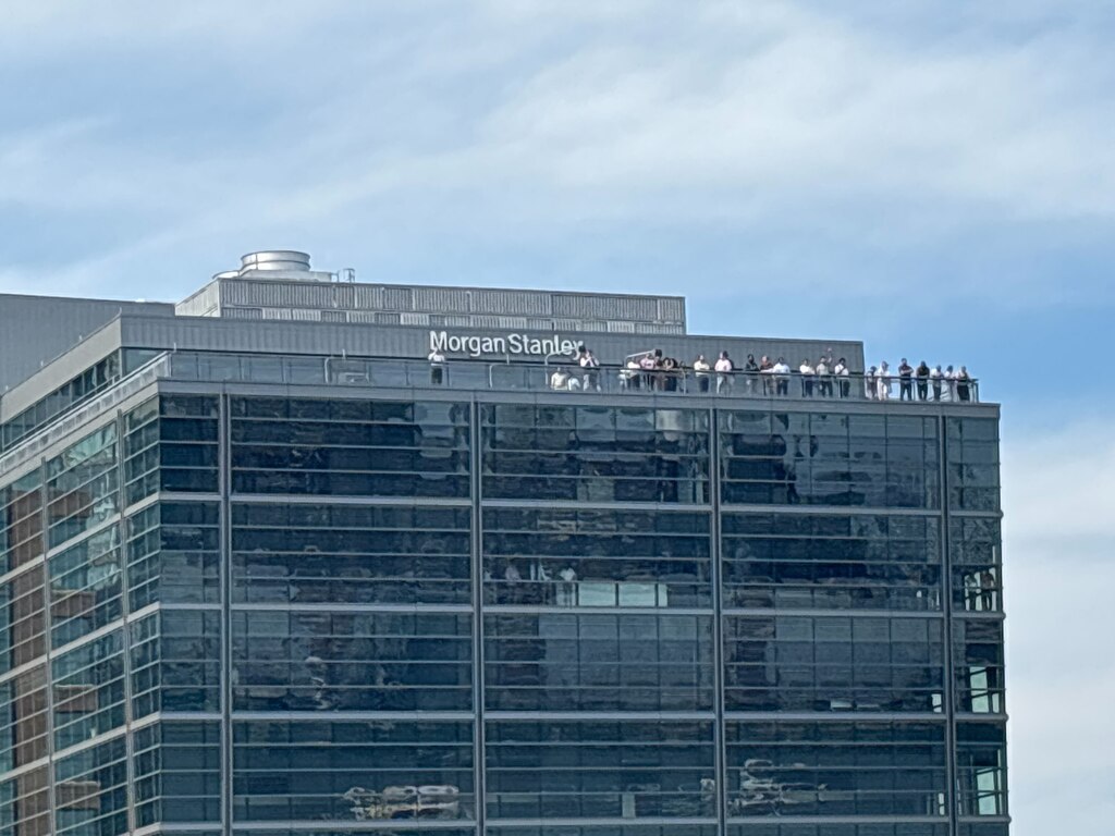 People watched from the Morgan Stanley building near Bond Street Wharf. They waived to the pirate ship. More people lined up with signs on decks leading up to Harbor East.