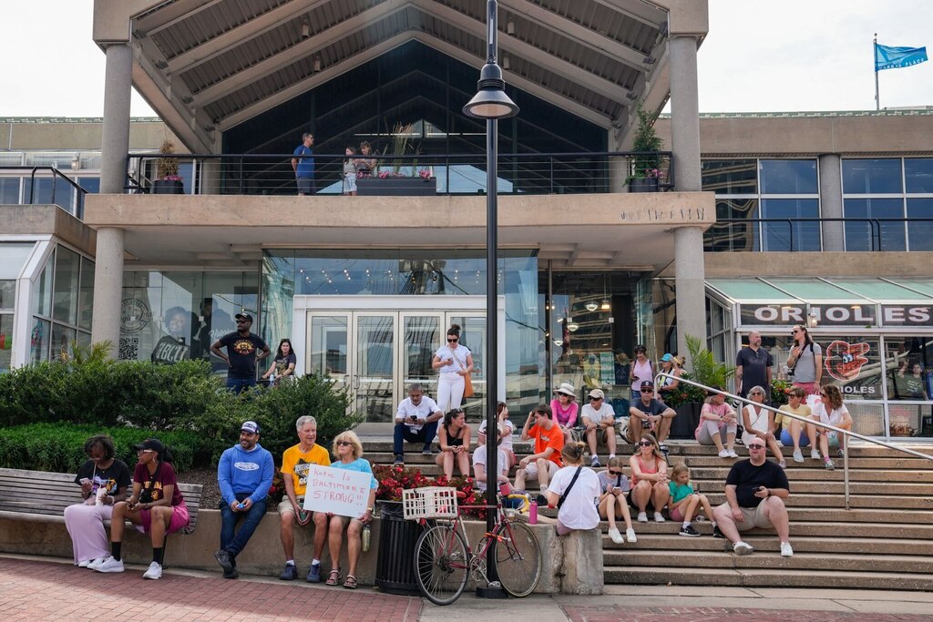 People found shade on the steps of Harborplace as Pumphrey keeps swimming toward the Inner Harbor amphitheater.