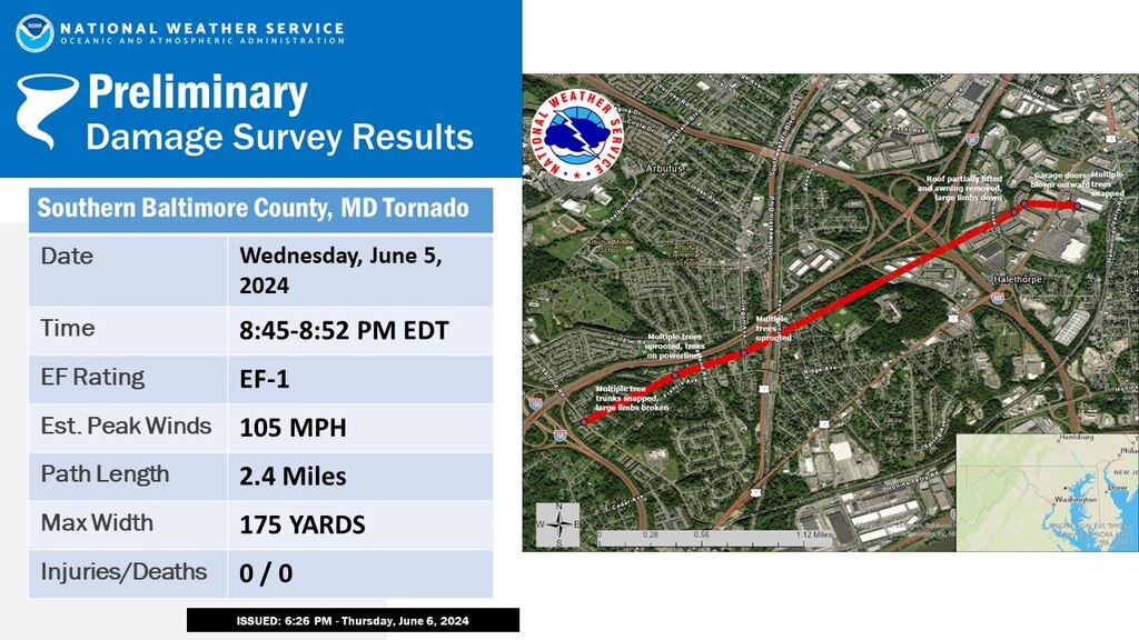 - There were two in Baltimore County. One started in Arbutus and ended in Halethorpe, traveling about 2.4 miles with a maximum wind speed of 105 mph. It snapped or uprooted trees and downed wires, and it also appears to have blown four heavy overhead doors out of a distribution warehouse.