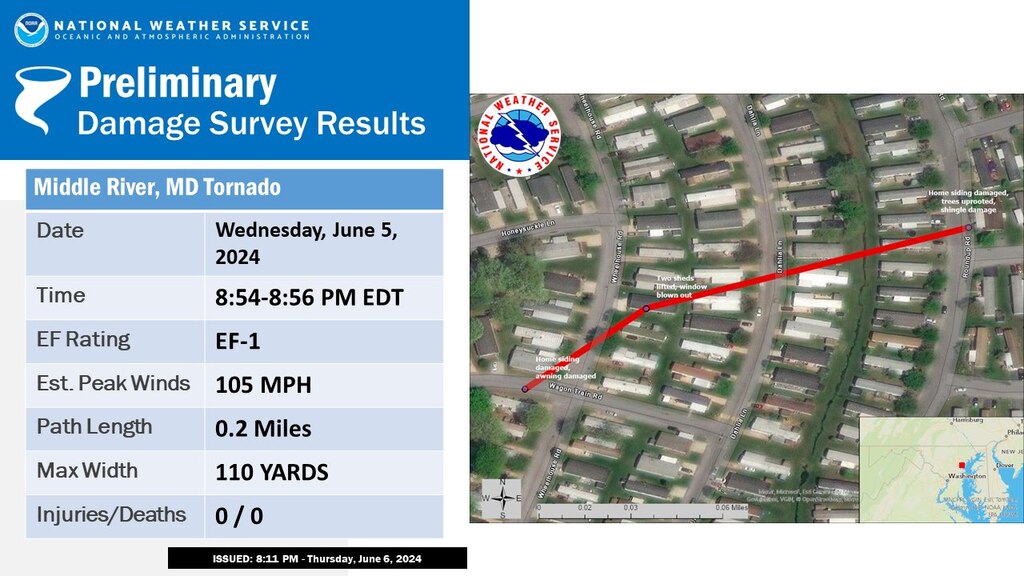 - The other Baltimore County tornado lasted for about two minutes and traveled less than half a mile in Middle River, ending at 7:56 p.m. It had an estimated peak wind speed of 105 mph. It caused damage in a mobile home community called Williams Estates, mostly ripping the underpinning from residences and blowing a shed and trampoline around.