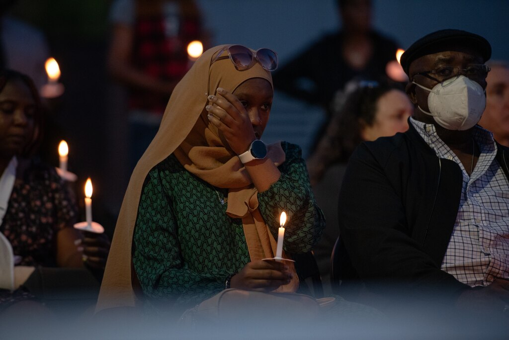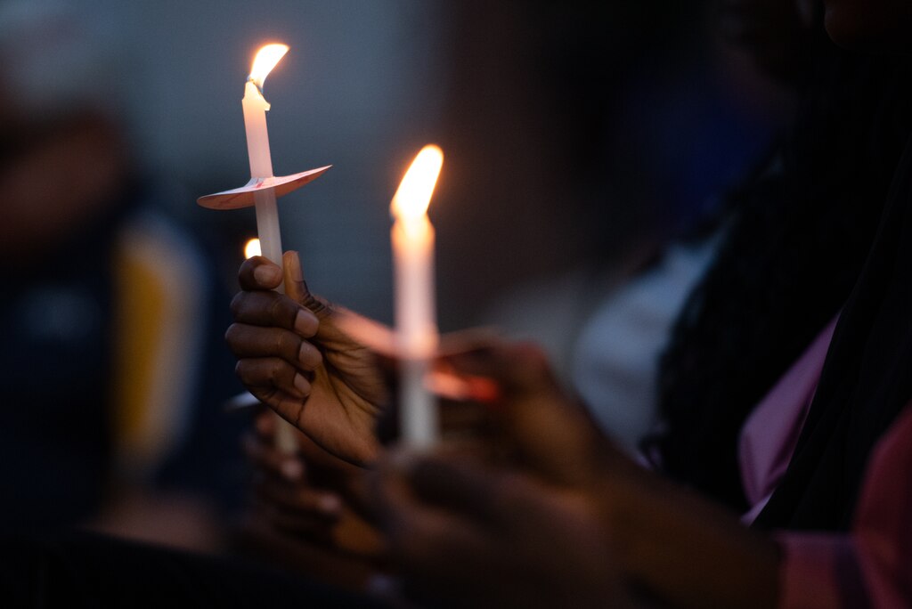 The candlelight vigil at the Essex campus of the Community College of Baltimore County was quiet enough to hear water flowing in the fountain.