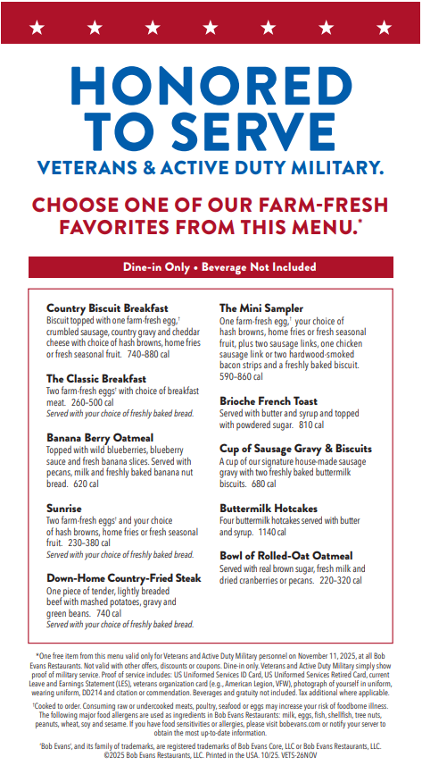 In a salute to those who have served or continue to serve, Bob Evans is giving veterans and active members who dine in free meals from a select menu that includes their classic breakfast, buttermilk hotcakes and sausage gravy and biscuits.