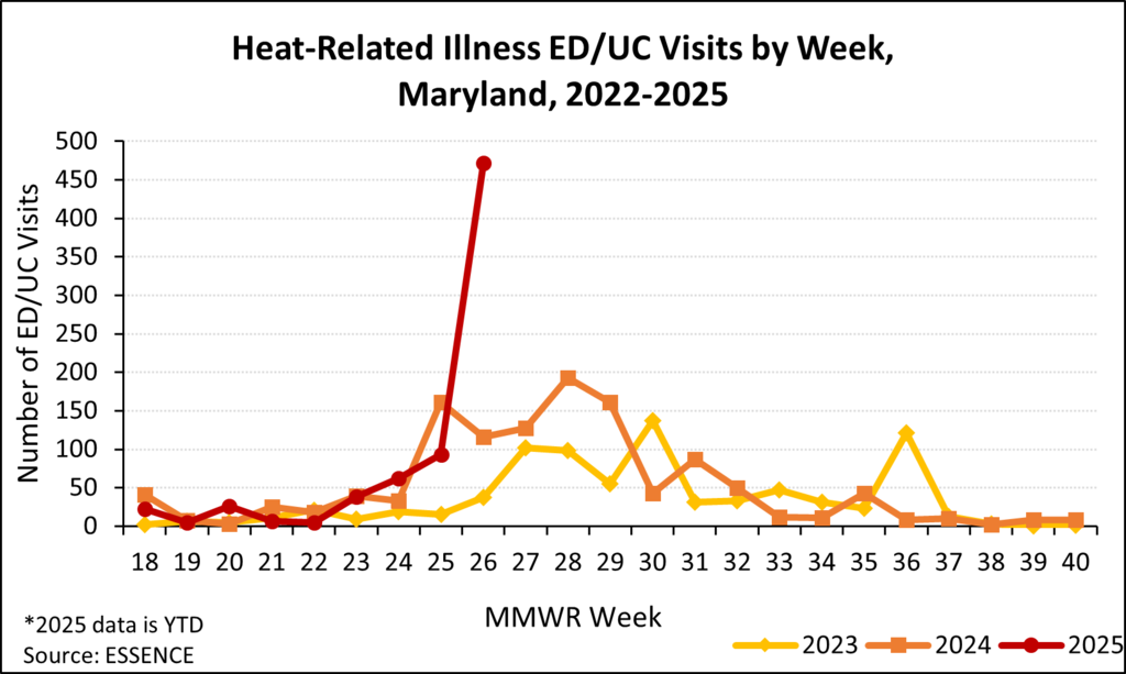 David McCallister, a spokesperson for the Maryland Department of Health, said that just nine weeks into the heat season, which runs from April through early October, Maryland has recorded 729 heat-related emergency department visits — over 60% of the total number of visits for all of 2024.
