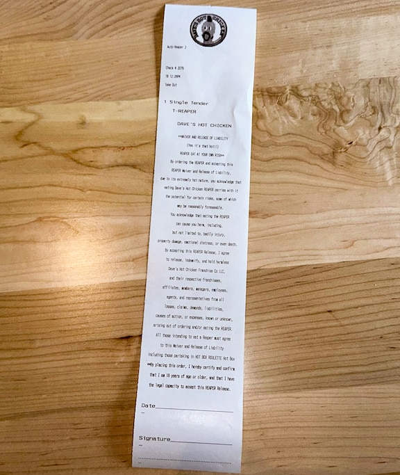 As The Banner Montgomery’s two food reporters, we set out to push our taste buds to the limit, trying all seven spice levels Dave’s has to offer – including the hottest level, the Reaper, fueled by Carolina Reaper peppers, for which Hau had to sign a waiver promising that the chain isn’t responsible for “bodily injury, property damage, emotional distress, or even death.” We were unclear whether that was a playful joke or a legit warning in a binding contract.