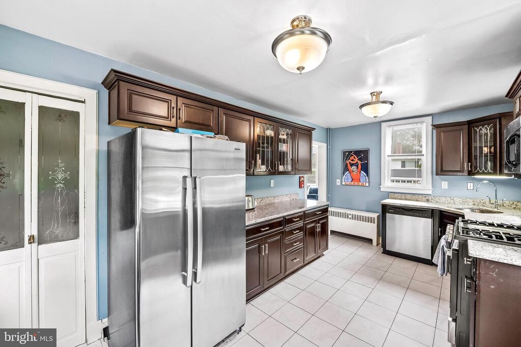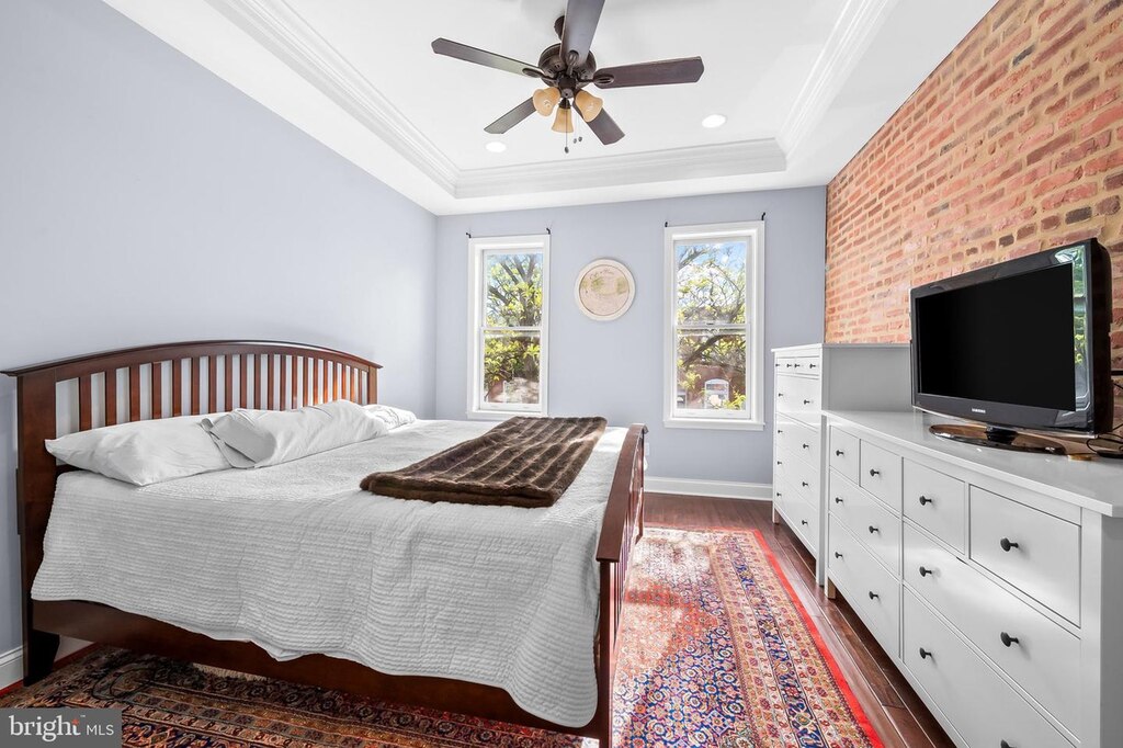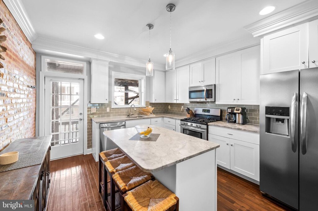 This Canton rowhouse has been nicely updated and is completely move-in ready. The home opens to a living room with stained glass, exposed brick and recessed lighting. There’s an open dining area, and behind it, an attractive eat-in kitchen. Upstairs, there are two bedrooms, including a primary bedroom with an en suite bathroom and large closet. The second bedroom provides access to the rooftop deck and has hall access to another full bathroom. The finished lower level offers two additional bedrooms, which could also be used as a family room or office, and a full bathroom.