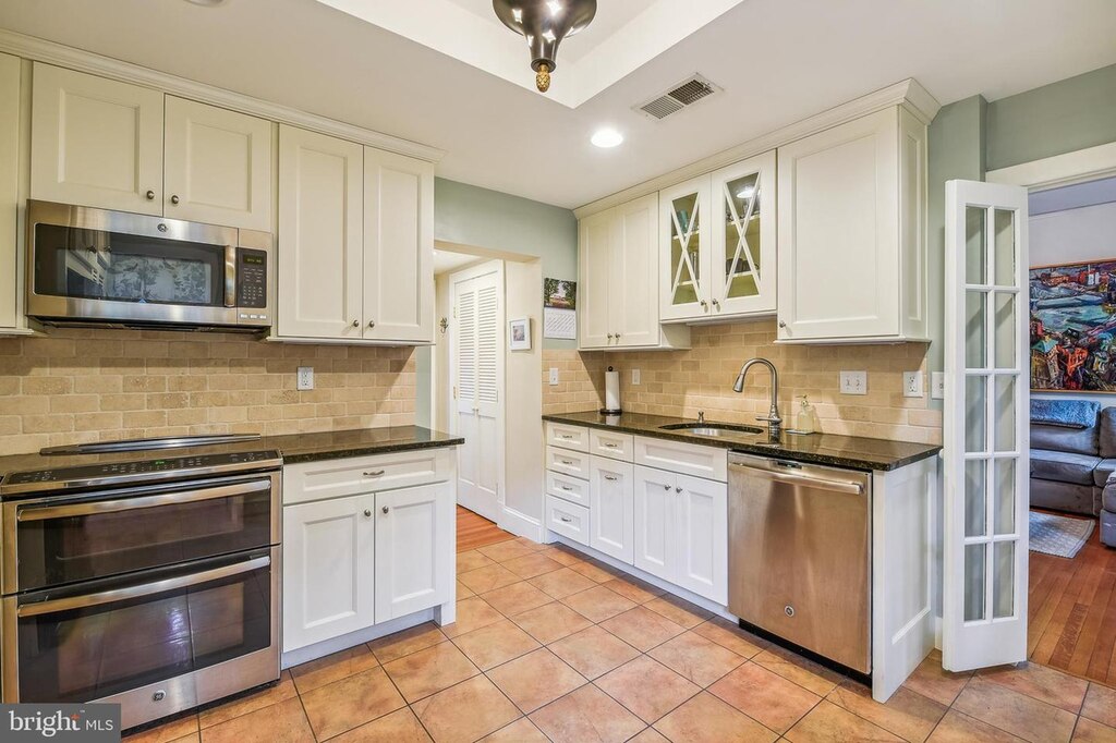 Nestled in Tuscany-Canterbury, you’ll find the Gardens of Guilford, a charming collection of white stucco and red-tiled roof condo buildings. This unit is packed with original details, including beautiful hardwood floors, large Palladian windows, and a wood-burning fireplace. The home opens to a bright living room, which serves as the heart of the home. French doors lead to a sunroom, which is currently being used as a dining room. Another set of French doors off the living room lead to a family room or den with built-in shelves. Enjoy an updated kitchen, with white cabinetry, granite countertops and lots of storage. The primary bedroom has an en suite bathroom. Two additional bedrooms and another full bathroom complete this charming unit.