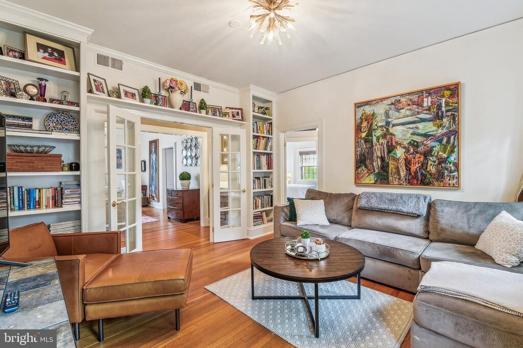 This traditional home has been beautifully maintained and updated. The home opens to a spacious living room, with a wood-burning fireplace and built-ins. A tasteful dining room has inlaid hardwood floors and another wall of built-ins. An updated kitchen sits at the back of the house, with a cozy breakfast nook attached. Upstairs, the second story has three bedrooms and a full bathroom. There’s the primary bedroom, a bedroom which is being used as a family room (with more built-ins!) and another small bedroom, which would be ideal as an office or den. Two additional bedrooms and another full bathroom are on the third level, offering plenty of space for a variety of uses.