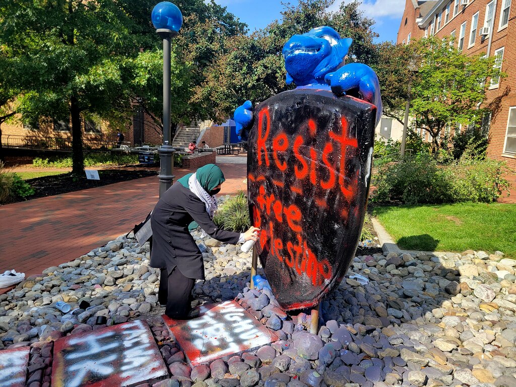 During the small gathering, a student read a poem from a Palestinian poet, a Jewish Goucher College student shared how he isn’t welcome in a Jewish group at his school since he supports Palestine and students spray painted a statue that once said “Don’t whitewash genocide” to “Resist. Free Palestine” in red paint.