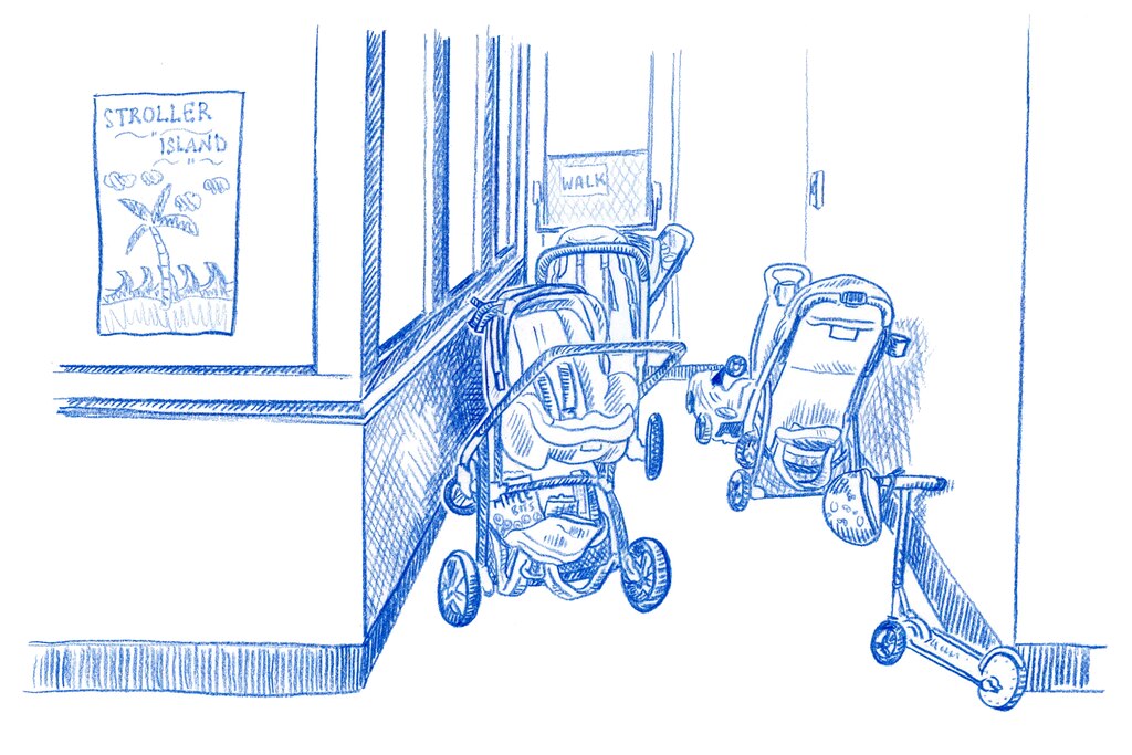 For those with little ones in tow, a nook to the right of the check-in desk serves as a designated holding area for strollers. “Last summer we had individual parking spots taped off and everything,” notes a staff member, “but this corner has worked out fine this season.”